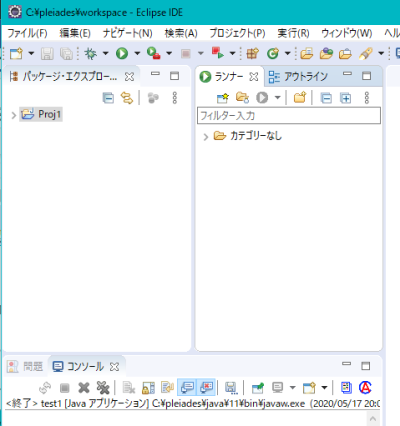 開発環境の左上を見ると、「パッケージ・エクスプローラー」と書かれているところがあり、そこには、先ほど作った、プロジェクト「 Proj1 」があります。