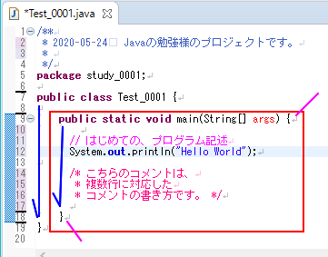 プログラムは、ブロックという小さな単位で書かれている。ブロックは、{ で、始まり、 } で終わるというものだ。(図中の赤四角枠)