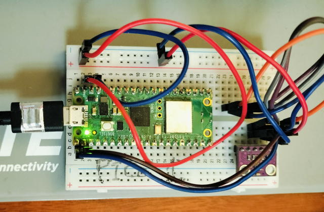 下の画像の緑色の物体が、 Raspberry Pi Pico W 本体です。長辺が一辺、5cm x 2cm 程度で、一枚1500円前後の商品です。右下の紫色が、温度・気圧センサーです。